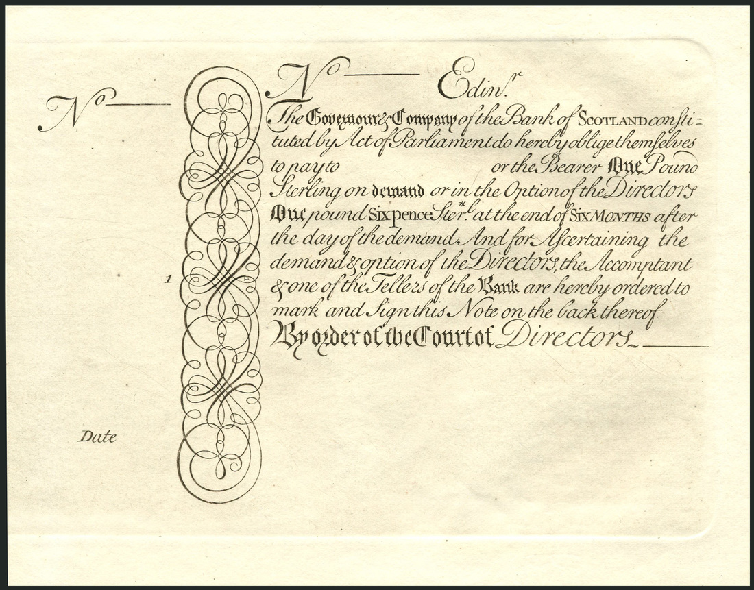 Bank of Scotland, a double proof pull for a £1 and sixpence with a six month option clause, ND (c1883), black and white, ornate scrip and issued on behalf of the Court of Directors, watermarked paper