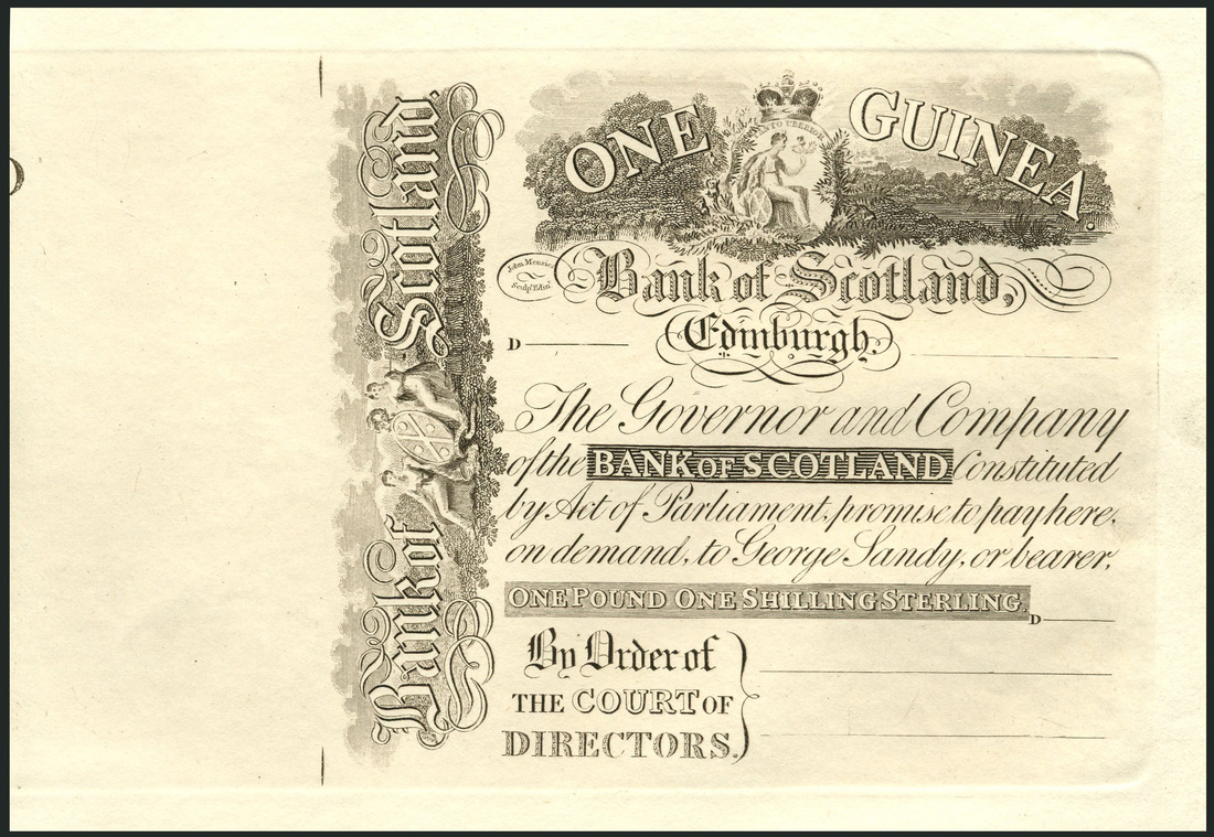 Bank of Scotland, a double proof pull for a 1 guinea, ND (ca 1810), black and white, ornate scrip and issued on behalf of the Court of Directors, Bank title and crowned vignette of Scotia top centre, bank title flanked by maidens at left, 'pay to George Sandy or bearer' in text at centre, plate D, watermarked paper