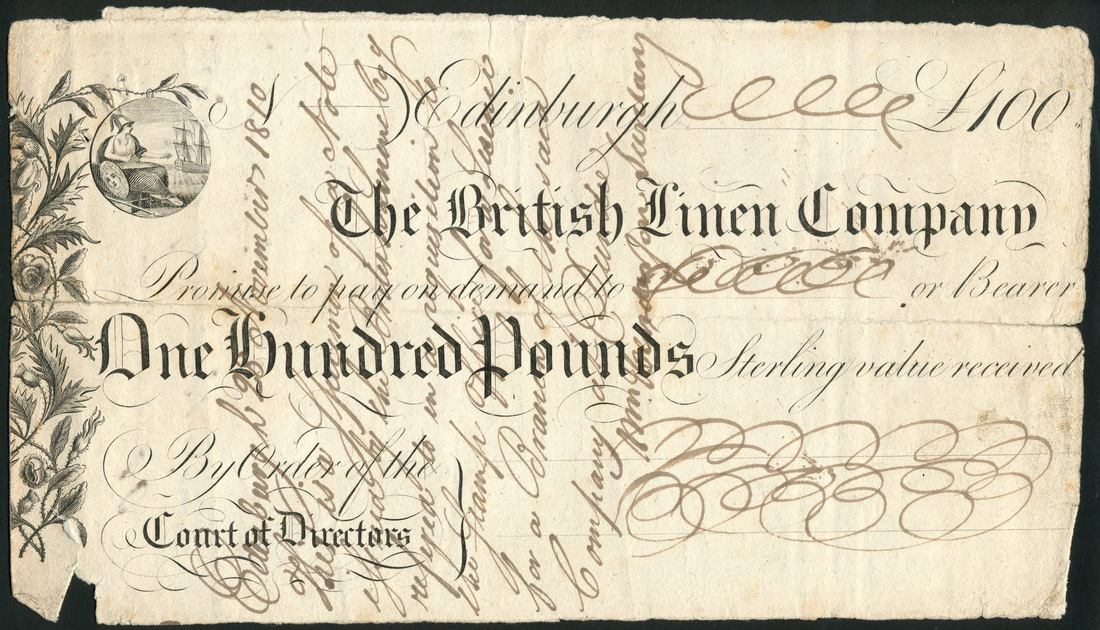 British Linen Company, specimen £100, 28 November 1810, black and white, vertical panel of thistles and roses at left, circular vignette of Pallas top left, referred to the stamp office for a licence for the Dundee branch