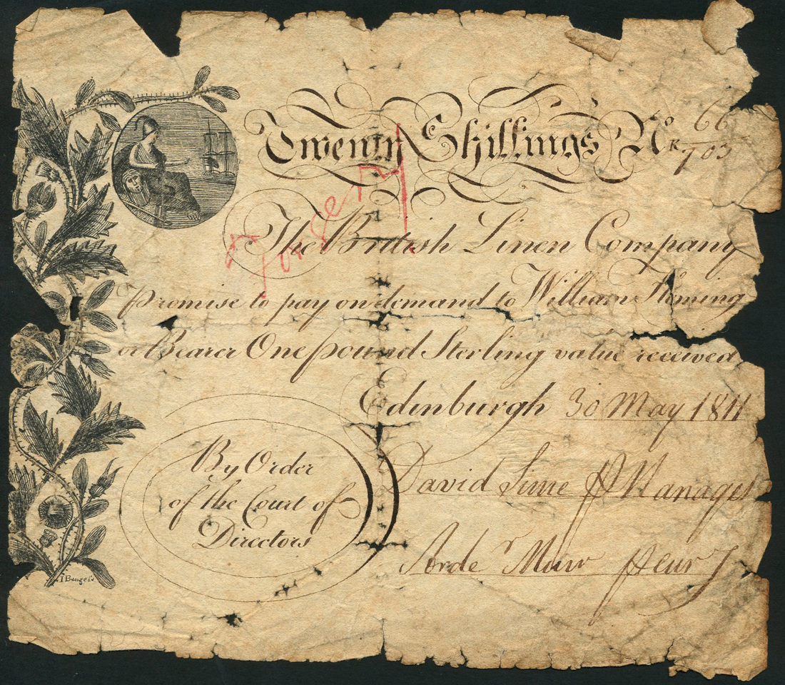 British Linen Company, forged £1, 30 May 1811, serial number 66/705, black and white, circular vignette of Pallas top left, vertical panel of roses and thistles at left, marked "Forgery" in red by hand, obverse only