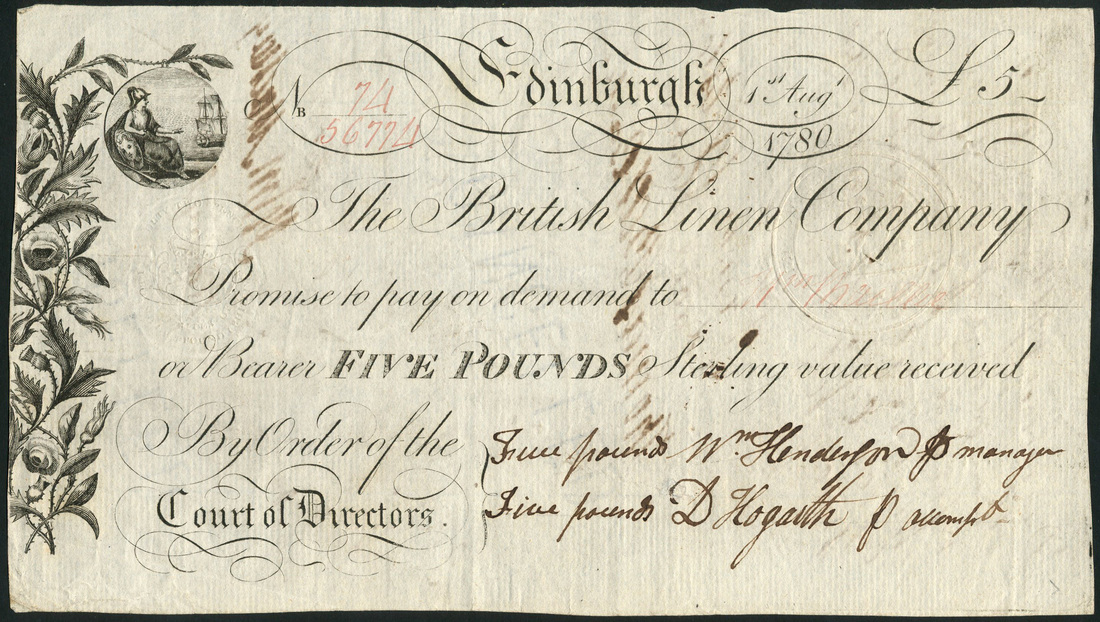 British Linen Company, £5, 1 August 1780, serial number B/74 56774, black and white, vertical panel of thistles and roses at left, circular vignette of Pallas top left, two manuscript signatures and verification of amount low right