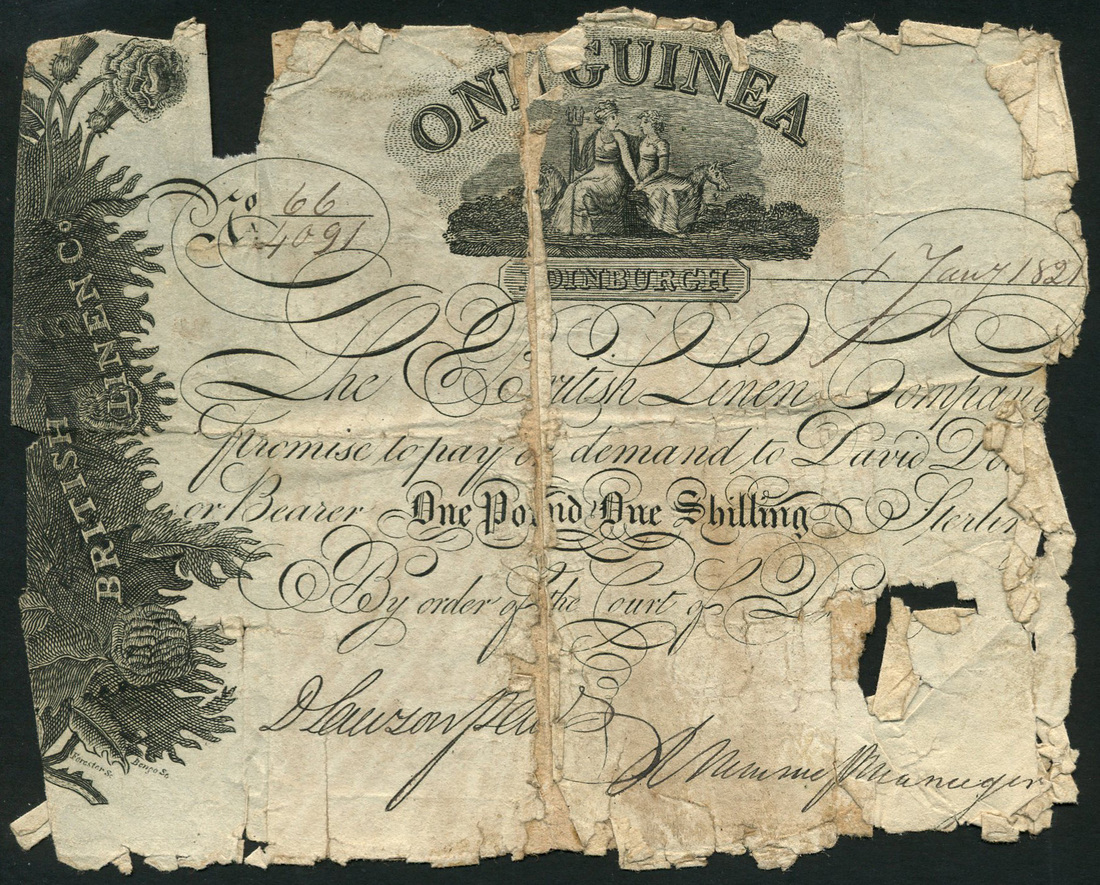 British Linen Company, contemporary forgery one guinea, 1 January 1821, serial number 66/4091, black and white, vignette with allegorical maidens top centre, vertical panel or roses and thistles at left