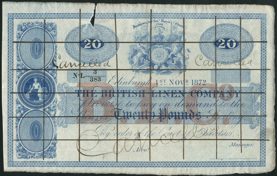 British Linen Company, specimen £20, 1 November 1872, serial number L3/383, blue and white, bank arms top centre flanked by value in blue circular tablets, ornate panel at left, red "B.L.Co." at centre,