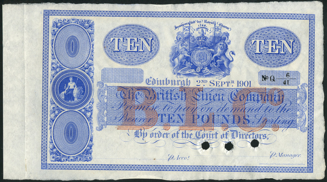 British Linen Company, £10, 2 September 1901, serial number Q6/41, blue and white, bank arms top centre flanked by value in blue tablets, ornate vertical panel at left, red "B.L.Co" at centre. Perkins Bacon print.