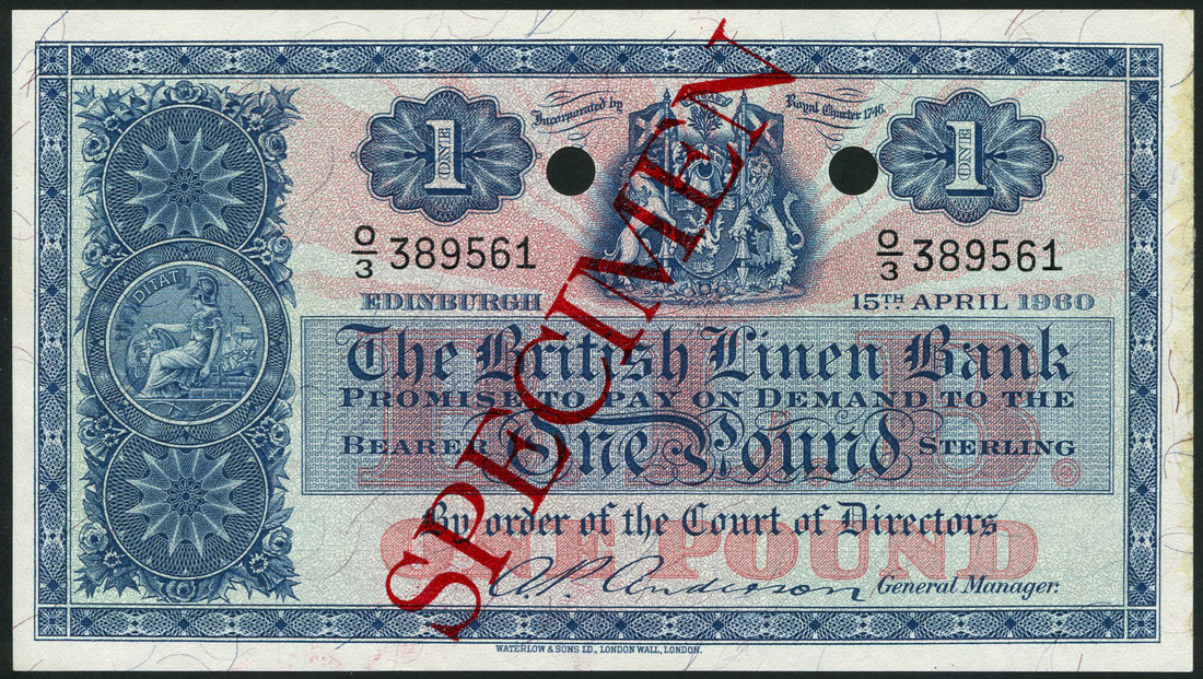 British Linen Bank, specimen £1 (2), 15 April 1960, 30 September 1961, serial numbers O//3 389561 and Q/3 000000,