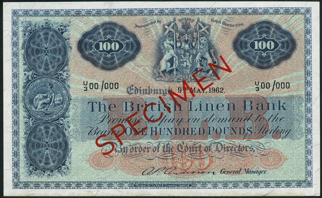 British Linen Bank, specimen £100, 9 May 1962, serial number U3 00/000, blue on red and light yellow sunburst underprint, bank arms top centre flanked by value, ornate panel at left, red "B.L.B" at centre, reverse, blue panel with DITAT emblem at centre, De La Rue printing