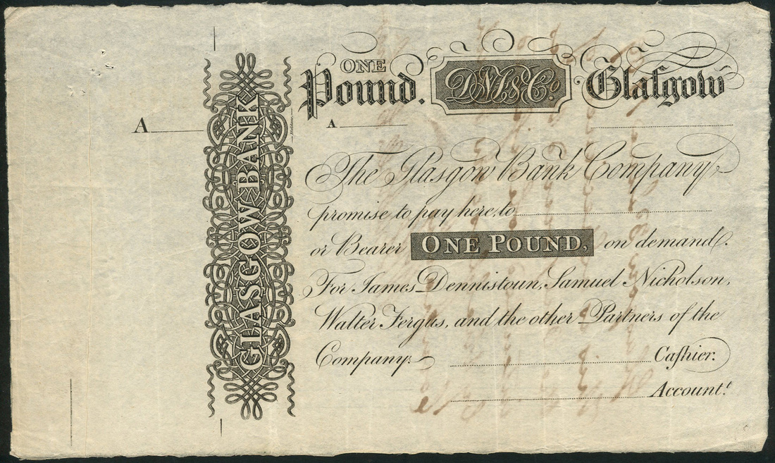 Glasgow Bank Company, unissued, £1, ND (ca 1809), black and white, bank initials in rectangular panel top centre, bank title at left, plate A, for James Dennistoun, Samuel Nicholson, Walter Fergus and the other partners of the Bank, counterfoil at left