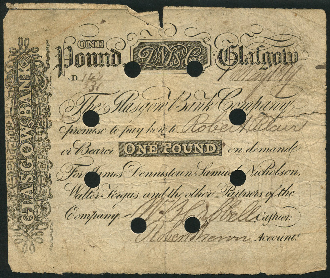 Glasgow Bank Company, £1, 1 May 1819, serial number 140/331, black and white, bank initials in rectangular panel top centre, bank title at left, plate A, for James Dennistoun, Samuel Nicholson, Walter Fergus and the other partners of the Bank, two signatures below