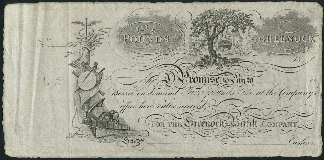 Greenock Bank Company, unissued £5, ND (ca 1820), black and white, ship's stern and oak tree top centre, allegorical symbols of commerce and prosperity at left, counterfoil at left