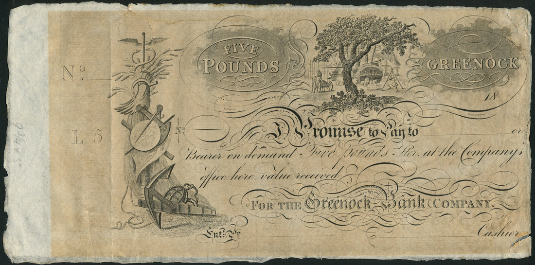 Greenock Bank Company, unissued £5, ND (ca 1820), black and white, ship's stern and oak tree top centre, allegorical symbols of commerce and prosperity at left, counterfoil at left