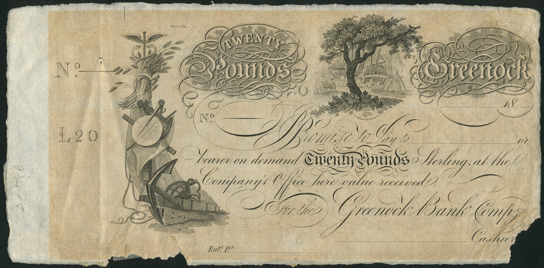 Greenock Bank Company, unissued £20, ND (ca 1820), black and white, ship's stern and oak tree top centre, allegorical symbols of commerce and prosperity at left, counterfoil at left