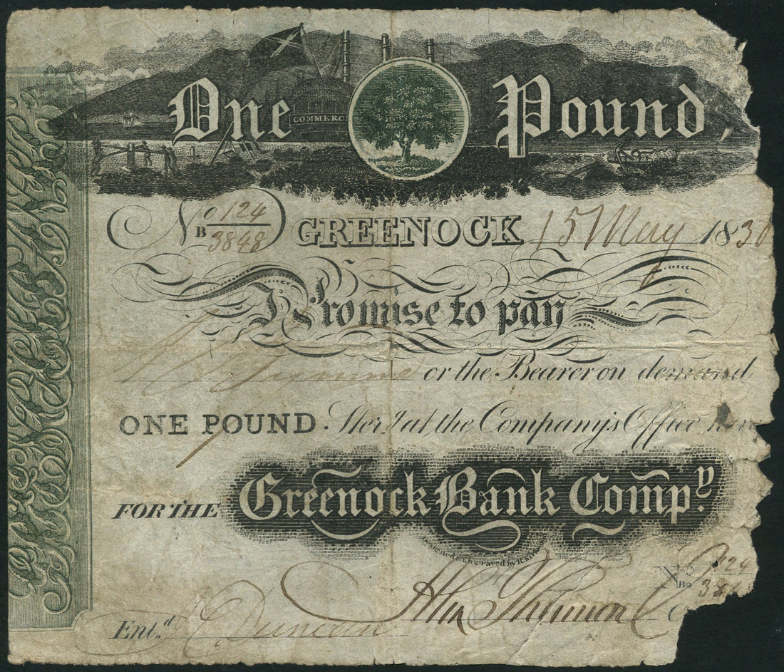 Greenock Bank Company, £1, 15 May 1830, serial number 124/3848, black and white, oak tree in circular green frame top centre, the Clyde Estuary and ship 'Commerce' in background, bank title in green at left, two manuscript signatures low centre