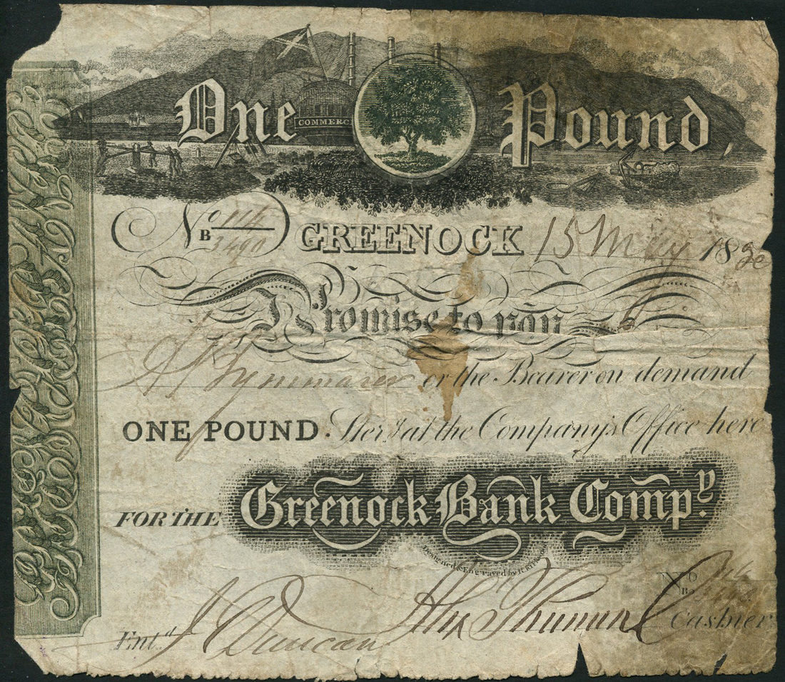 Greenock Bank Company, £1, 15 May 1830 serial number 114/3490, black and white, vignette of oak tree in green top centre with illustration of River Clyde in background, two manuscript signatures, green vertical panel at left