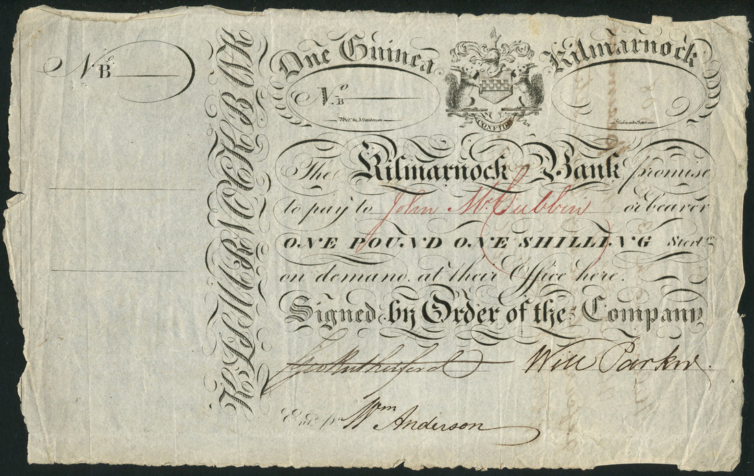 Kilmarnock Bank, part issued £1 one shilling, ND (ca 1802), black and white, arms top centre, counterfoil at left, three manuscript signatures below