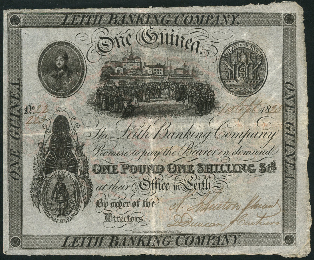 Leith Banking Company, one guinea, 1 September 1825, serial number 22/223, black and white, central vignette of the arrival of George IV flanked by vignette of a portrait of the King at left and bank Arms of Leith at right, bank title and value within border