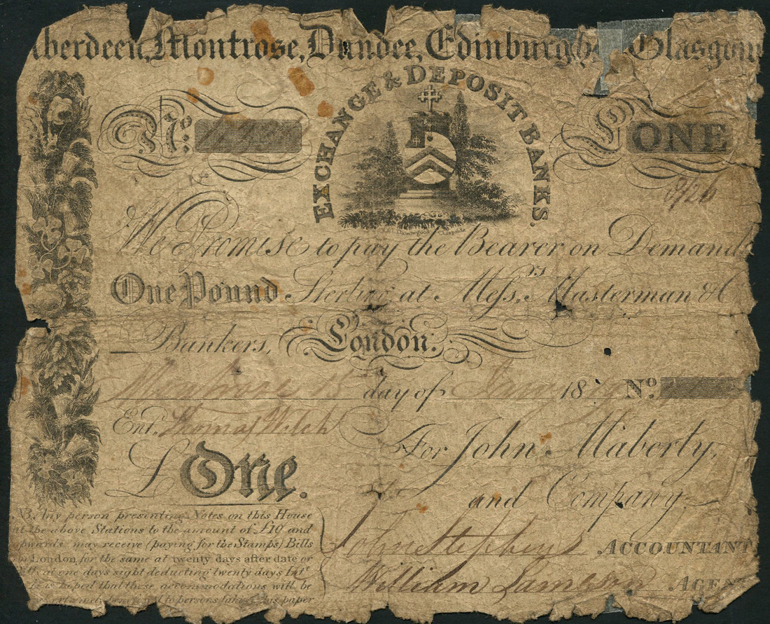 John Maberley & Company, Aberdeen, Montrose, Dundee, Edinburgh & Glasgow Exchange & Deposit Banks, £1, Montrose, 13 January 1819, serial number 4334, black and white, arms laureate top centre, border of thistles at left, three signatures below, presentation clause low left rare
