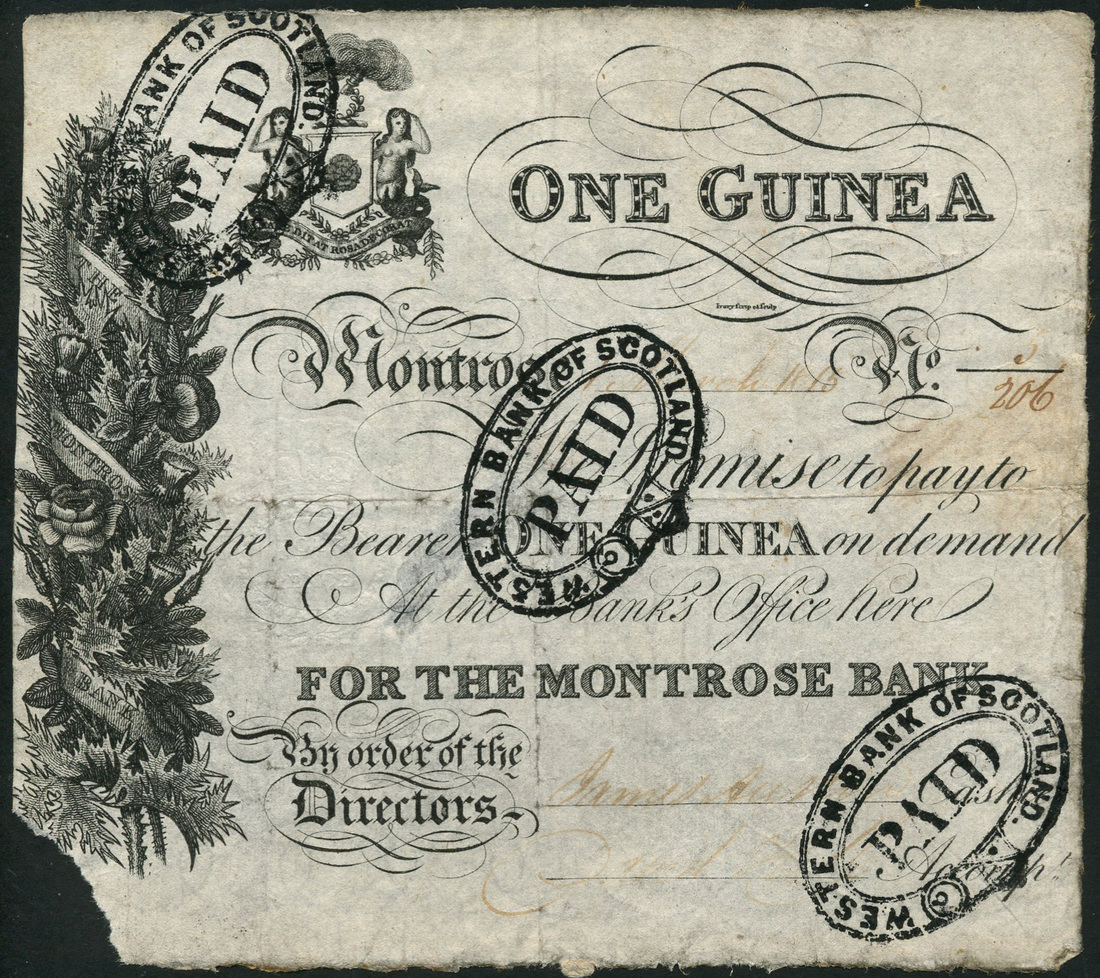 Montrose Bank, one guinea, 1 March 1815, serial number 5/206, black and white, arms top left, border of thistles and roses at left, value in grey rectangular tablet top right, two manuscript signatures low right