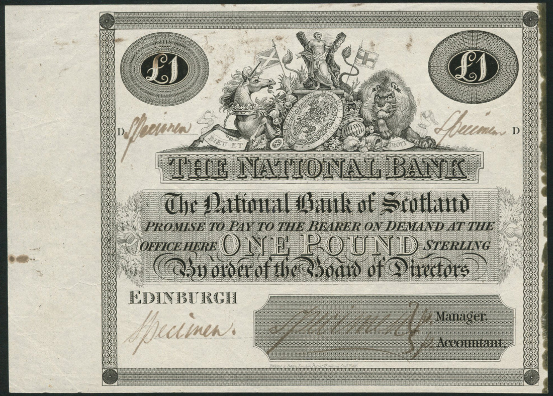 National Bank of Scotland, proof £1, ND (ca 1825), black and white, Royal Arms top centre with lion and unicorn and surmounted by a Cross of Saint Andrew, value in black oval top left and right. Plate D
