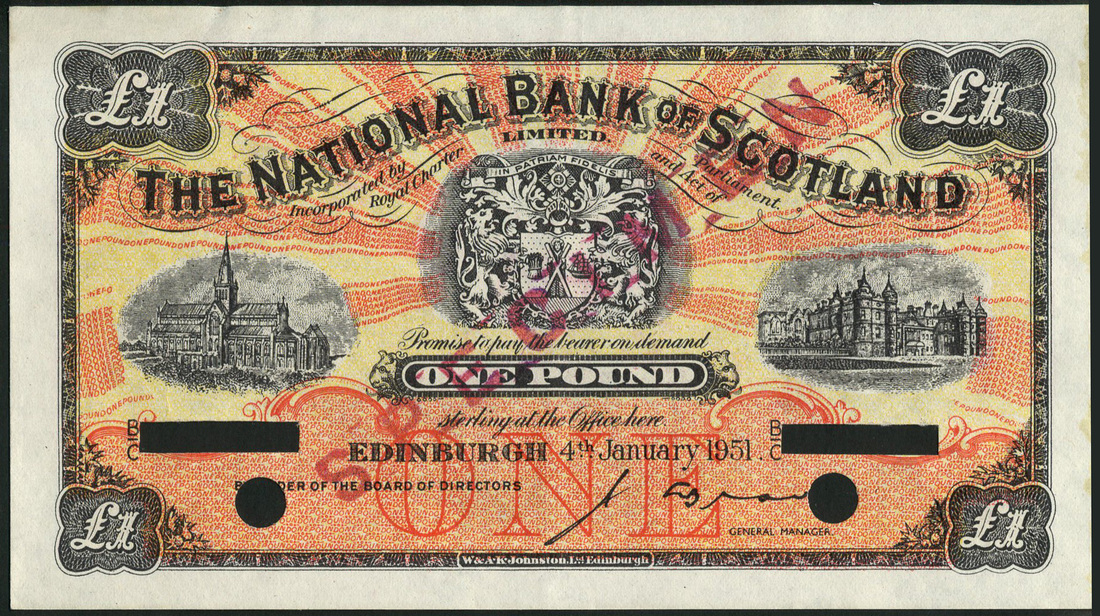 National Bank of Scotland Limited, £1 (4), 1 May 1942, 15 June 1946, 4 January 1951 and 10 May 1956, prefixes A/S, A/V, - , B/O, black, yellow and pink-red, arms at centre, Drever, Leggatt, Brown and Alexander signatures respectively