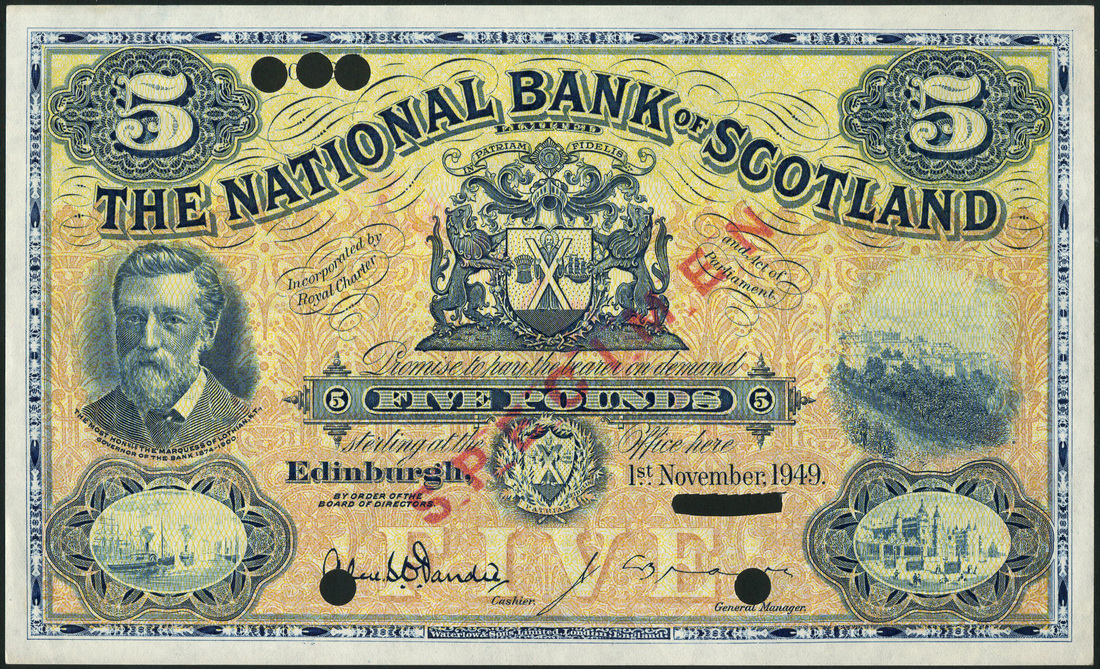 National Bank of Scotland Limited, specimen £5, 1 November 1949, blue, yellow and pale red-brown, arms top centre, the Marquis of Lothian and shipping on the Clyde at left, Edinburgh Castle and Holyrood House at right, arms low centre, value top left and right, signatures of Dandie and Brown, reverse blue, Princes Street at centre, value at left and right