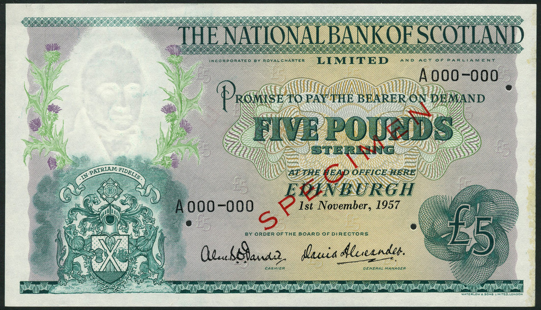 National Bank of Scotland, specimen £5, 1 November 1957, serial number A 000-000, green, pale orange and mauve, arms low left, value at centre and low right, Dandie and Alexander signatures, reverse green, the Forth Bridge