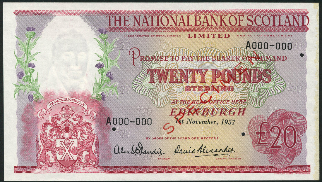 National Bank of Scotland Limited, specimen £20, 1 November 1957, serial number A 000-000, red, pale orange and green, arms low left, value at centre and low right, Dandie and Alexander signatures, reverse red, the Forth Bridge