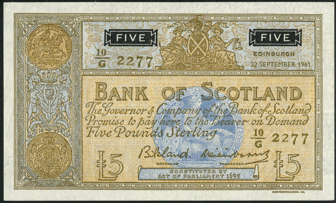 Bank of Scotland, £1 (2), 1961,1965, prefixes B and A/O, £5 (2), 1961,1962, prefixes 10/G and 10/N, all orange-brown, arms at left, Scotia in blue at centre, Bilsland and Watson signatures