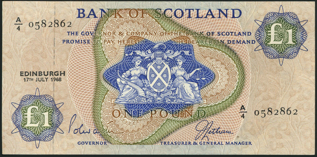 Bank of Scotland, £1 (2), 1966,1967, prefixes A/U and A/7, £5 (2), 1967, prefixes H and I, all orange-brown, arms at left, Scotia in blue at centre, Polwarth and Letham signatures, also £1 (2), 1968,1969 and £5, 1969, arms in blue at centre, Polwarth and Letham signatures