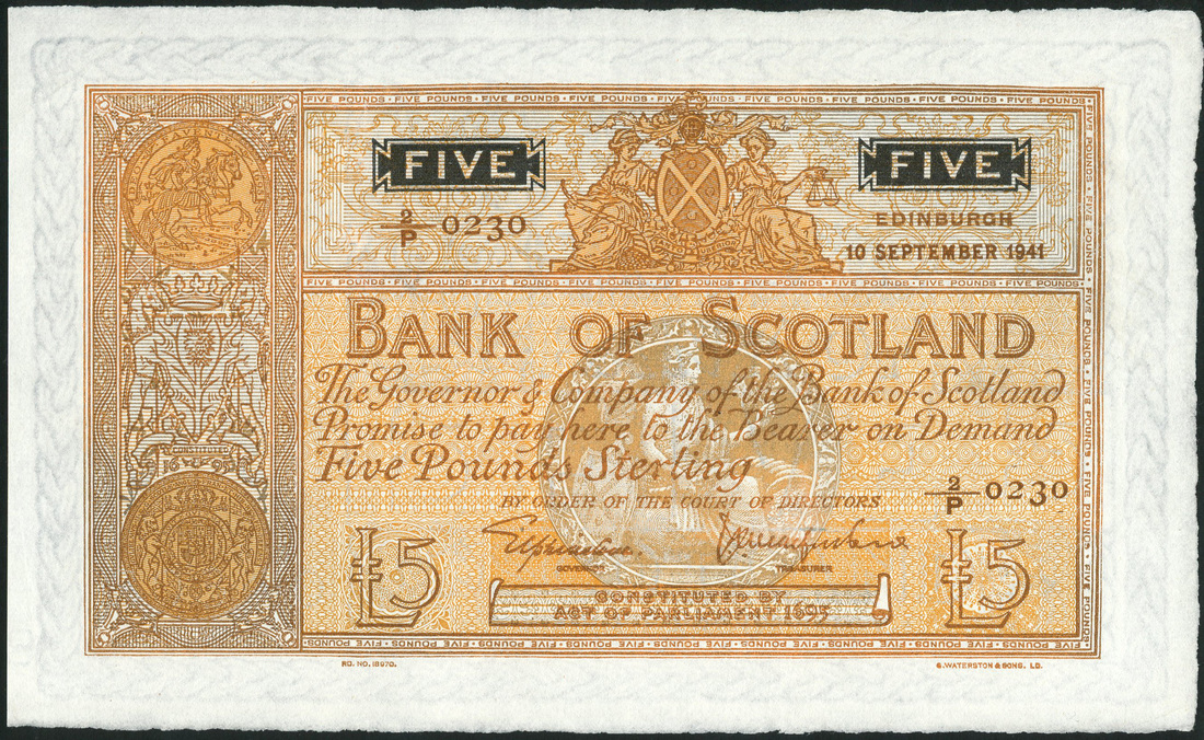 (x) Bank of Scotland, £5, 10 September 1941, serial number 2/P 0230, orange-brown, arms and unicorns at left in grey, Great Seal of Scotland, Scotia in circular grey panel right centre, Elphinstone and Beveridge signatures, reverse blank