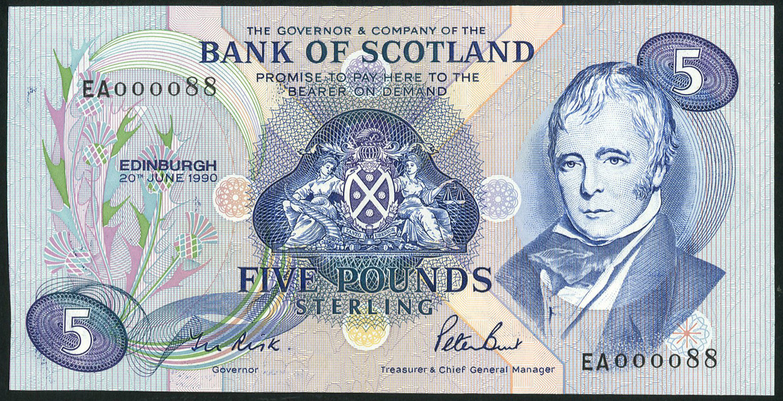 Bank of Scotland, £5 (4), 1990 (2), Risk and Burt, serial numbers EA 000088 and EA 000175, 1991,1994, serial number EK 000102 and prefix FBPattullo and Burt, blue,