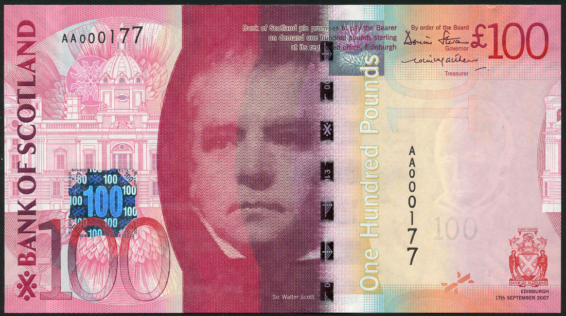 Bank of Scotland, a set of the 17 September 2007 issue comprising £5,10,20,50 and £100, all serial number AA 000177, all Sir Walter Scott portrait