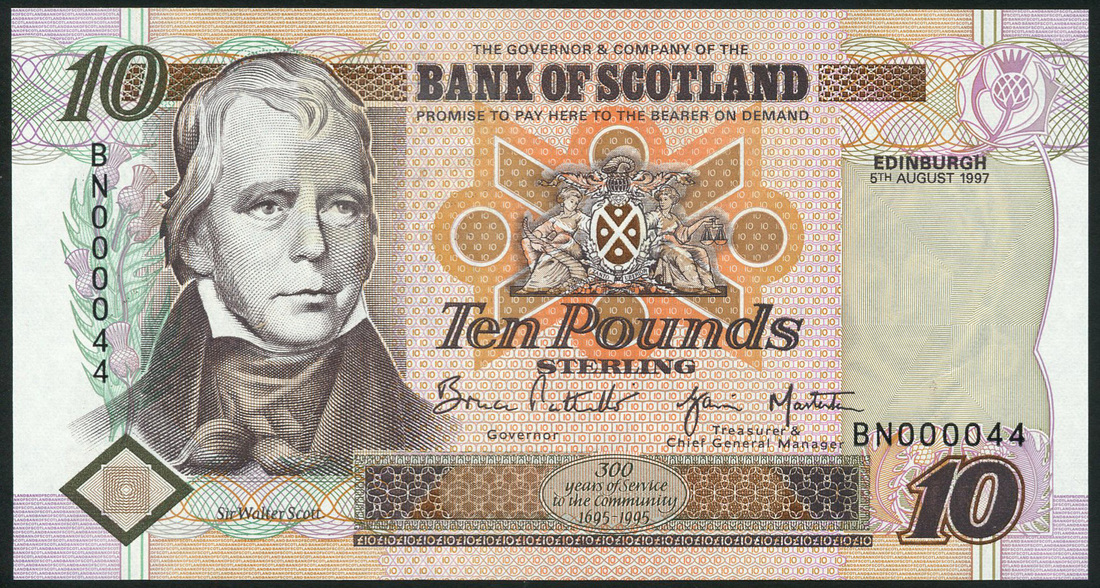 Bank of Scotland, £10, 1995, serial numbers AA 000424, brown, Sir Walter Scott at left, arms at centre, Pattullo and Burt signatures, also 1997, serial number BN 000044, brown, Sir Walter Scott at left, arms at centre, Pattullo and Masterton signatures