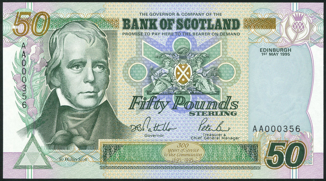 Bank of Scotland, £10, 1995, brown, £20, 1995, purple and £50, 1995, green, all Sir Walter Scott at left, arms at centre, Patullo and Burt signatures, all serial number AA 000356