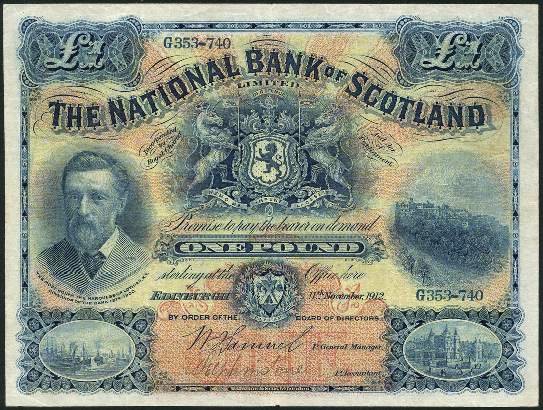 National Bank of Scotland Limited, 31, 11 November 1912, serial number G353-740, dark blue on red and yellow sunburst underprint, portrait Marquess of Lothian at left, bank title top centre, with arms below, value top left and right and at low centre, view of Edinburgh Castle at right, Samuel signature, reverse, view of Edinburgh within ornate blue panel