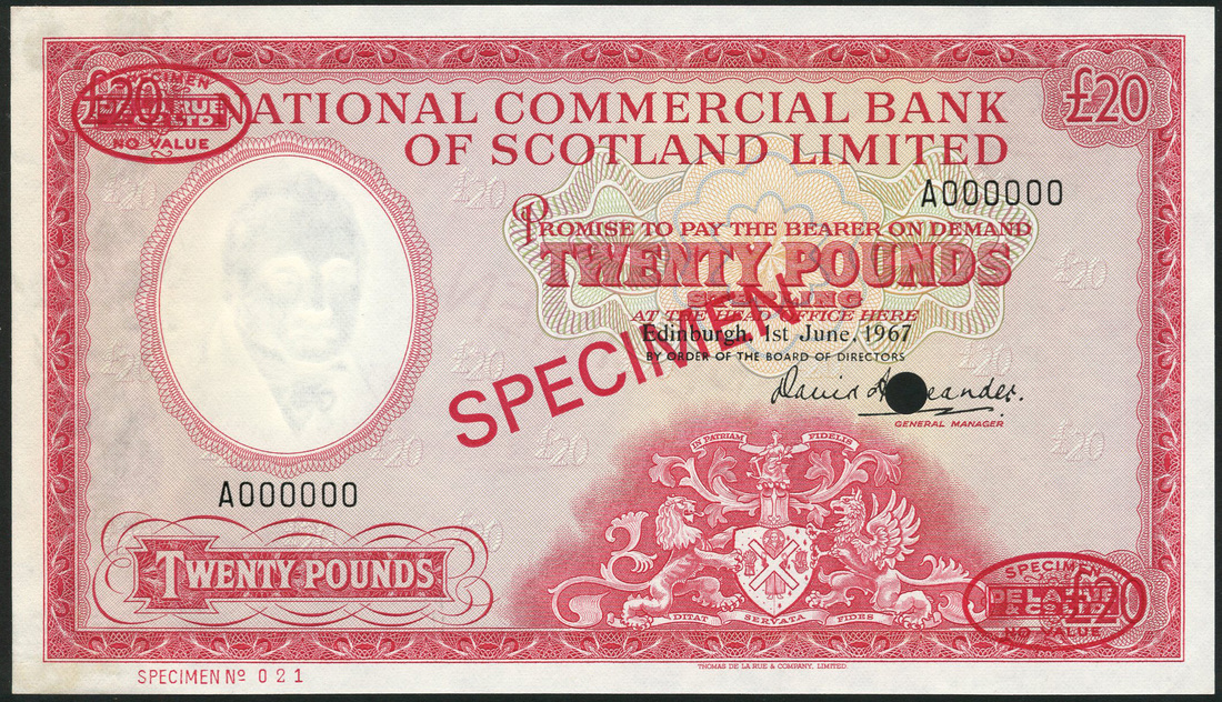 (†) National Commercial Bank of Scotland Limited, specimen £20, 1 June 1967, serial number A000000, signature David Alexander, red and multicoloured, arms at lower centre, value in each corner, reverse Forth Rail Bridge, overprinted SPECIMEN diagonally in red with two De La Rue specimen ovals on obverse and reverse, one punch hole
