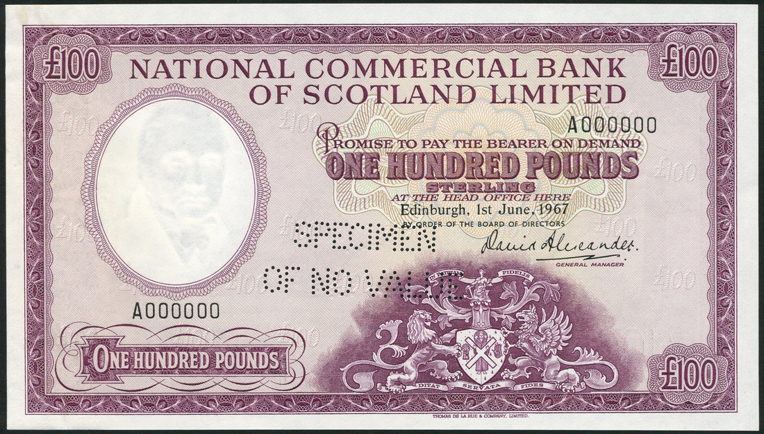 (†) National Commercial Bank of Scotland Limited, specimen £100, 1 June 1967, serial number A000000, signature David Alexander, purple and multicoloured, arms at lower centre, value in each corner, reverse Forth Rail Bridge, perforated SPECIMEN OF NO VALUE