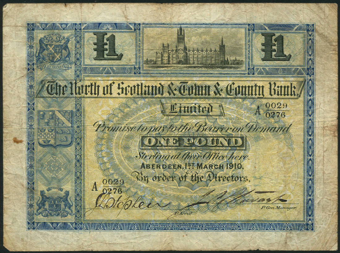 North of Scotland & Town & Country Bank Limited, £1, 1 March 1910, serial number A 0029/0276, blue and yellow, illustration of Marischal College in Aberdeen flanked by value in square panels at top centre, three coats of arms in ornate panel at left, value in black tablet at centre, reverse, bank title and arms in circular panel at centre