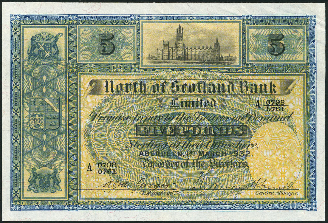North of Scotland Bank Limited, £5 March 1932, serial number A 0798/0761, blue and yellow, Marischal College, Aberdeen top centre flanked by value, ornate panel at left with three coats of arms, bank title at centre, Harvey Smith signature, reverse, bank arms at centre