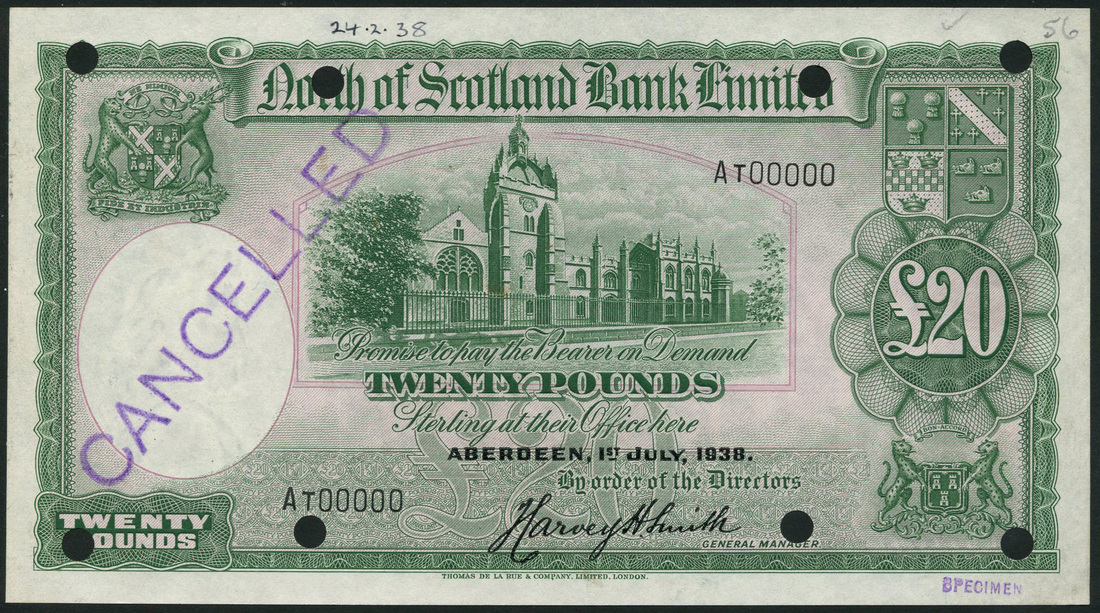(†) North of Scotland Bank Limited, specimen £20, Aberdeen, 1 July 1938, serial number AT 00000, green and lilac, the Marischal college at centre, arms top left and right, printed signature of Harvey Smith, reverse green and lilac, arms at centre