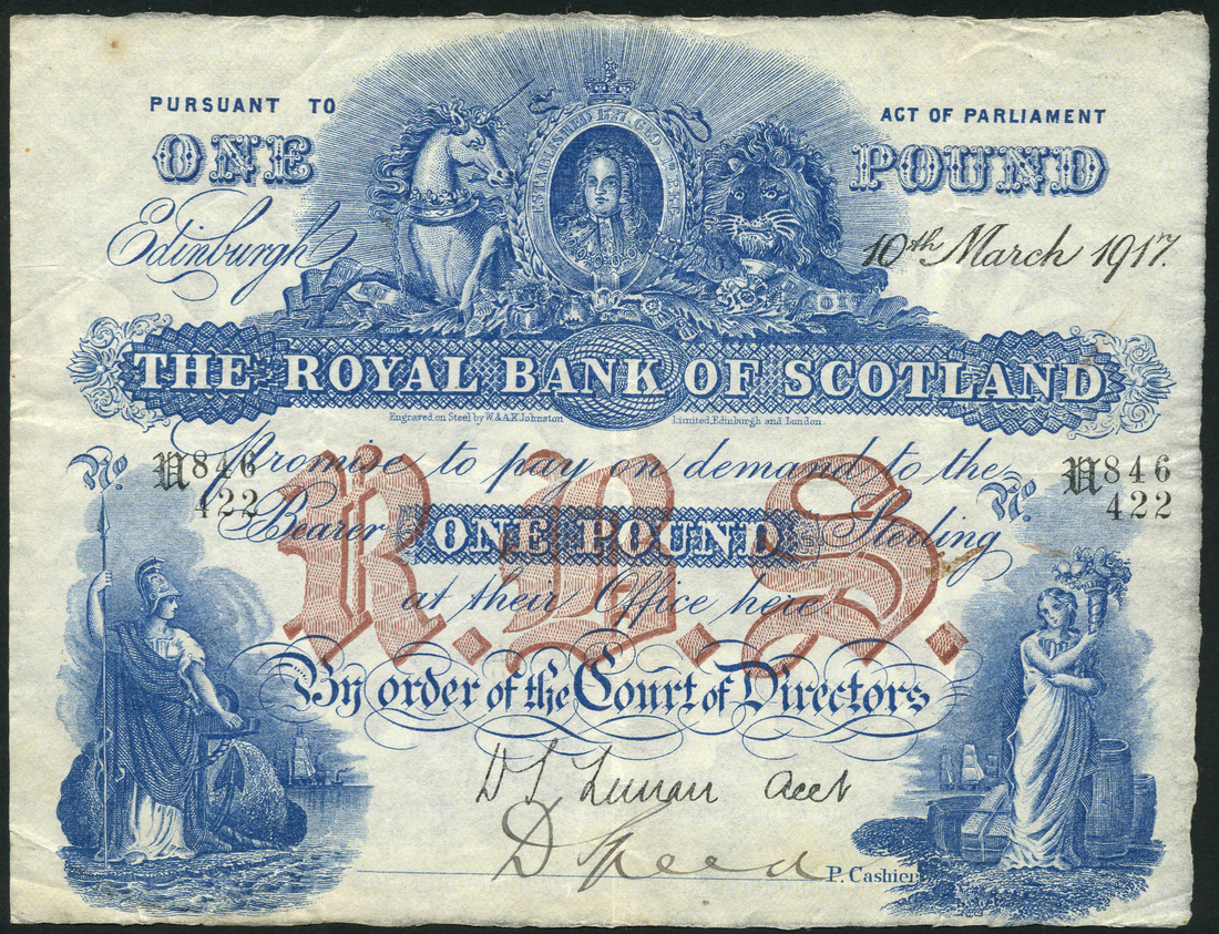 Royal Bank of Scotland, £1, 10 March 1917, serial number N846/422, uniface, blue and white, portrait George I flanked by lion and unicorn top centre, allegorical maidens at low left and right, red RBS at centre, D.S Lunan signature