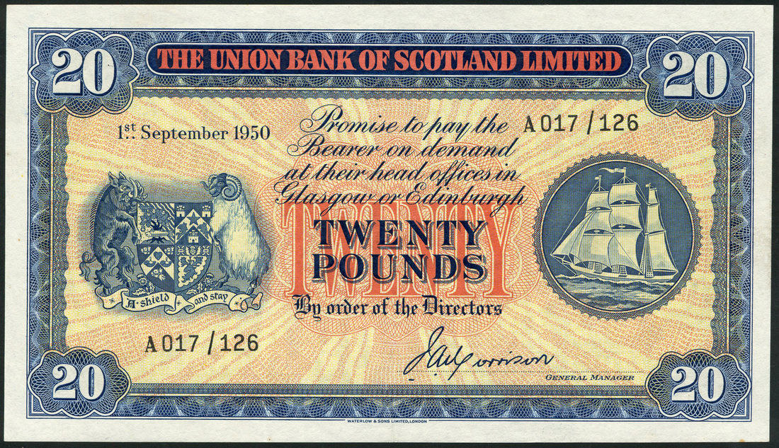 Union Bank of Scotland Limited, £20, 1 September 1950, serial number A 017/126, £5 (2), 1950, serial number A017 126, 1952, serial number B744/125, all with dark blue on red and yellow sunburst underprint, bank title top centre, value at centre, bank arms at left and sailing ship at right, value in each corner, Morrison signature