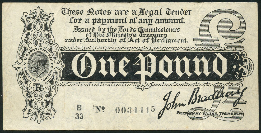 Treasury Series, John Bradbury, £1, ND (1914), serial number B/33 0034445, black and white, head of George V at left, pound symbol at right