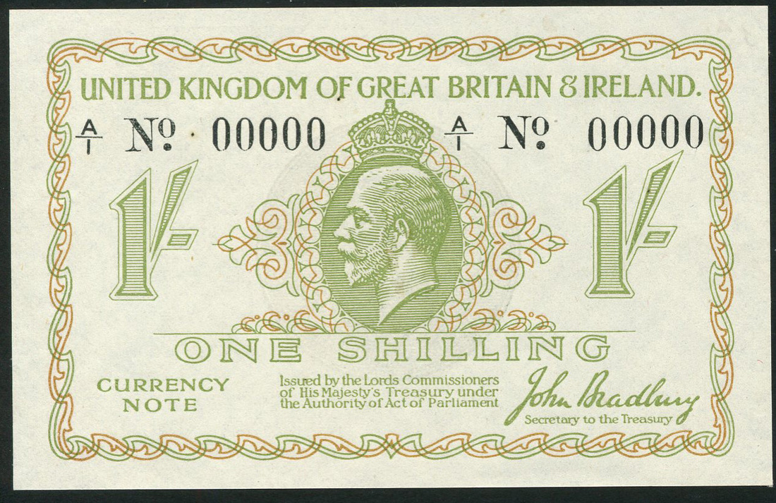 Treasury Series, John Bradbury, colour trial 1/-, ND (1918), serial number A/1 00000, green, brown and white, crowned head of George V at centre, value at left and right and low centre, printed signature of John Bradbury low right, ornate border around, reverse a 1/- coin at centre