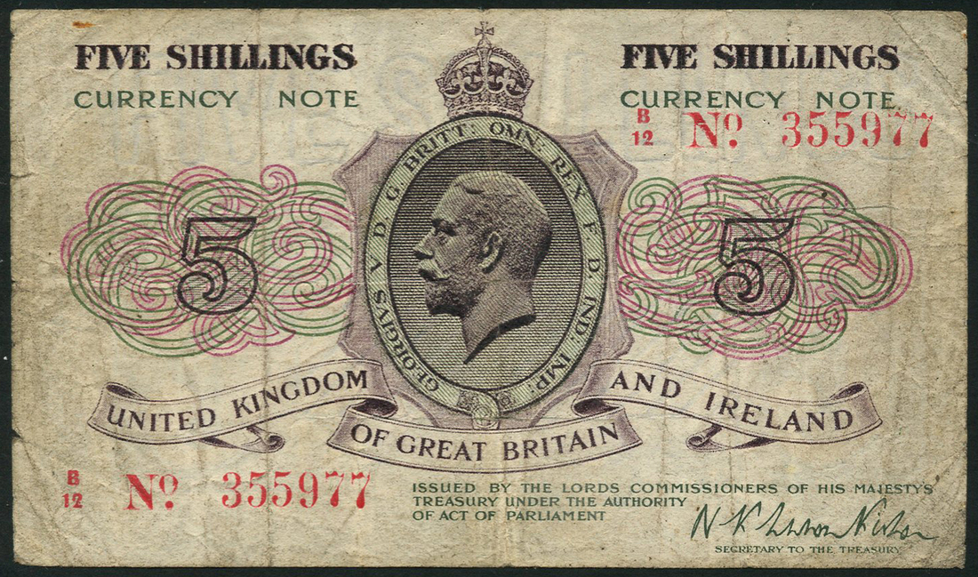 Treasury Issue, N.F.Warren-Fisher, 5/-, ND (1919), red serial number B/12 355977, green, lilac and white, crowned head of George V at centre, value at left and right, printed signature of N.F.Warren-Fisher at low right, reverse value in green tablet at centre