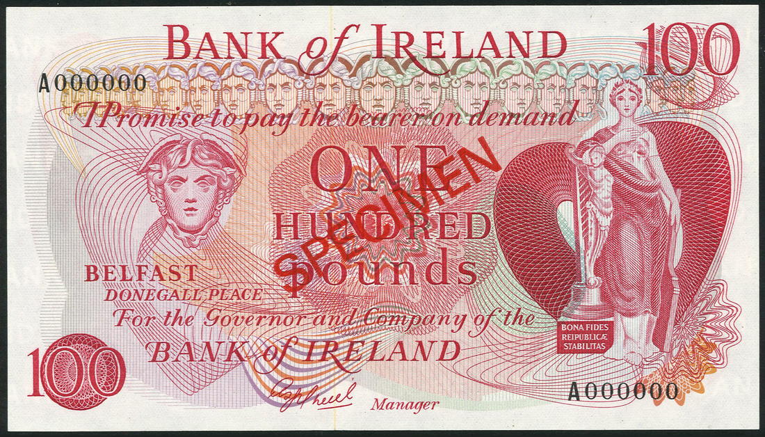 (x) Bank of Ireland, a small group of specimens comprising, £5, serial number Q 000000, £10, serial number U 000000, and £100, serial number A 000000, ND (1967-90), blue, brown and red respectively, all feature Medusa head at centre left, Hibernia at right, O'Neill signature