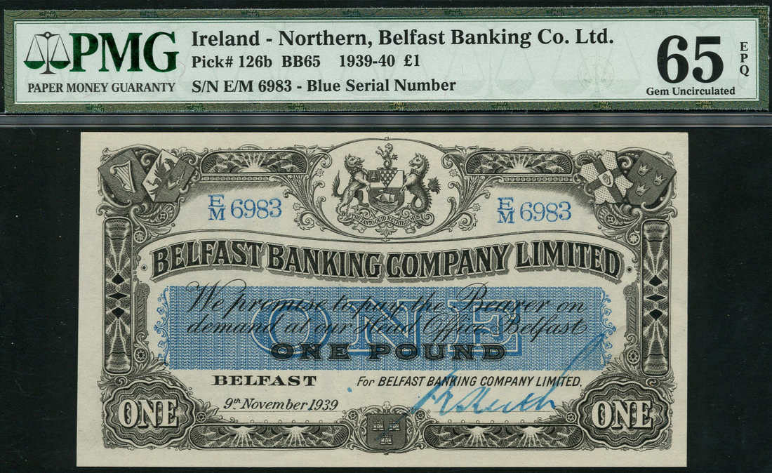 Belfast Banking Company Limited, £1, 9 November 1939, serial number EM6983, black and white, arms top centre with bank title below, value low left and right and in blue tablet at centre, ornate border, reverse, blue panel with bank title and value