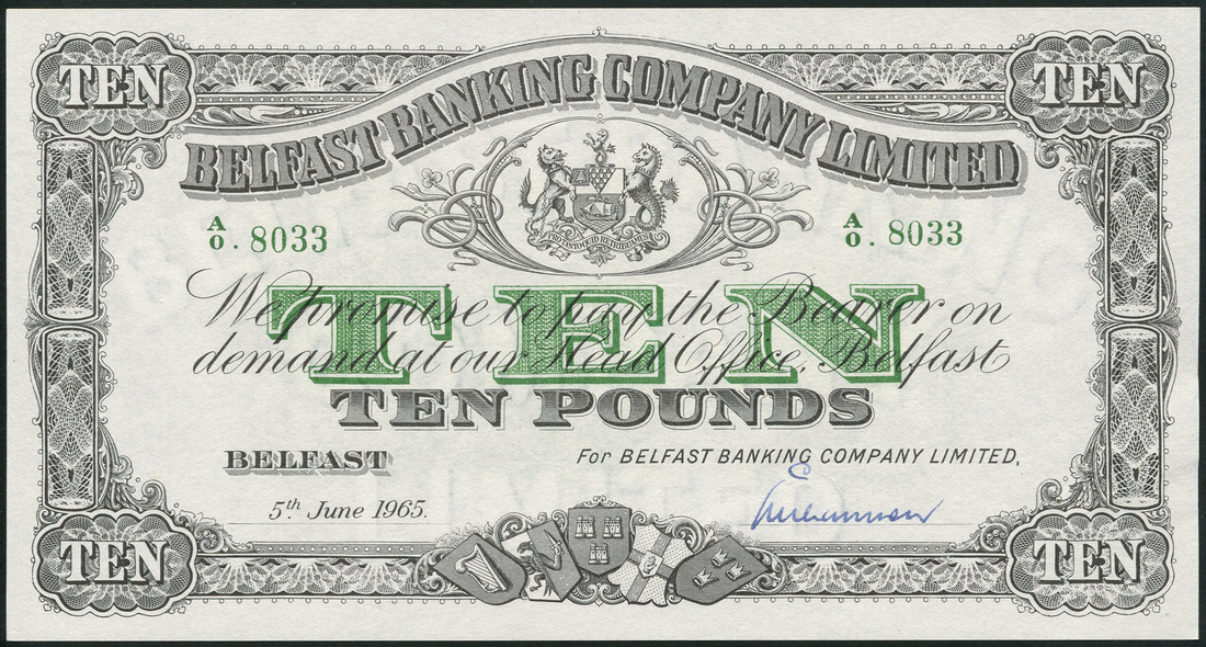 Belfast Banking Company Limited, £1, 9 November 1939, serial number E/M6673, black on blue, £5 (2), 2 October 1942, serial number D/Q 8275, 6 january 1966, serial number ED 07968, both black on red, £10, 5 June 1965, serial number A/O 8033, black on green