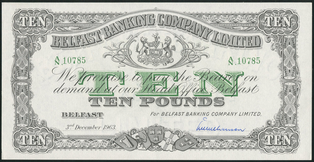 Belfast Banking Company Limited, £10, 3 December 1963, serial number AN 10785 black with value in green at centre, arms top centre manuscript lower right, arms top centre