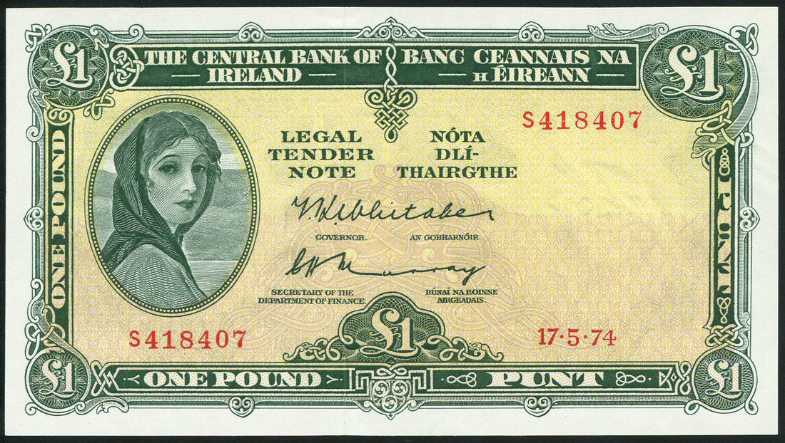 Central Bank of Ireland, 10 shillings (2), 1957,1968, orange and pale green, £1 (2), 1959,1962, green, also £1 (4), 1970,1974,1976 (2), green, all Lady Lavery at left