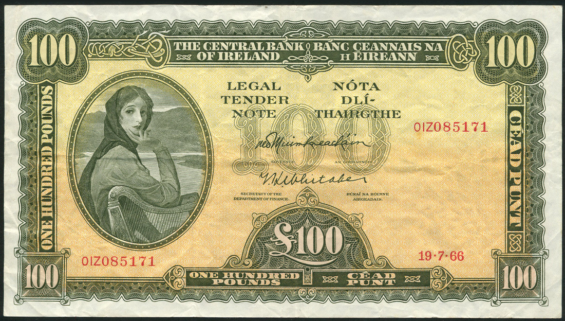 Central Bank of Ireland, 10 shillings, 1968, prefix 88P, orange and green, £20, 1976, red, Murray and O'Murchu, £100, 1966, green and pale yellow and orange, Muimhneachain and Whitake signatures, all Lady Lavery at left